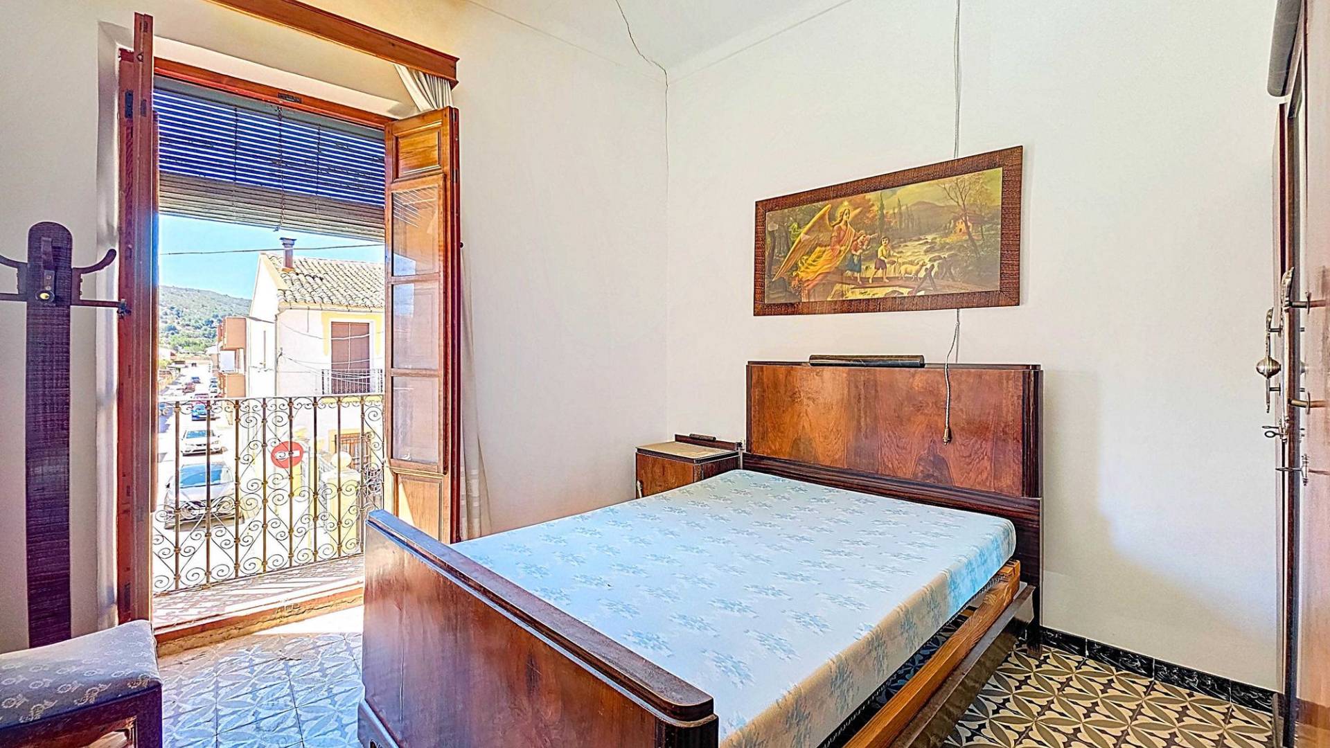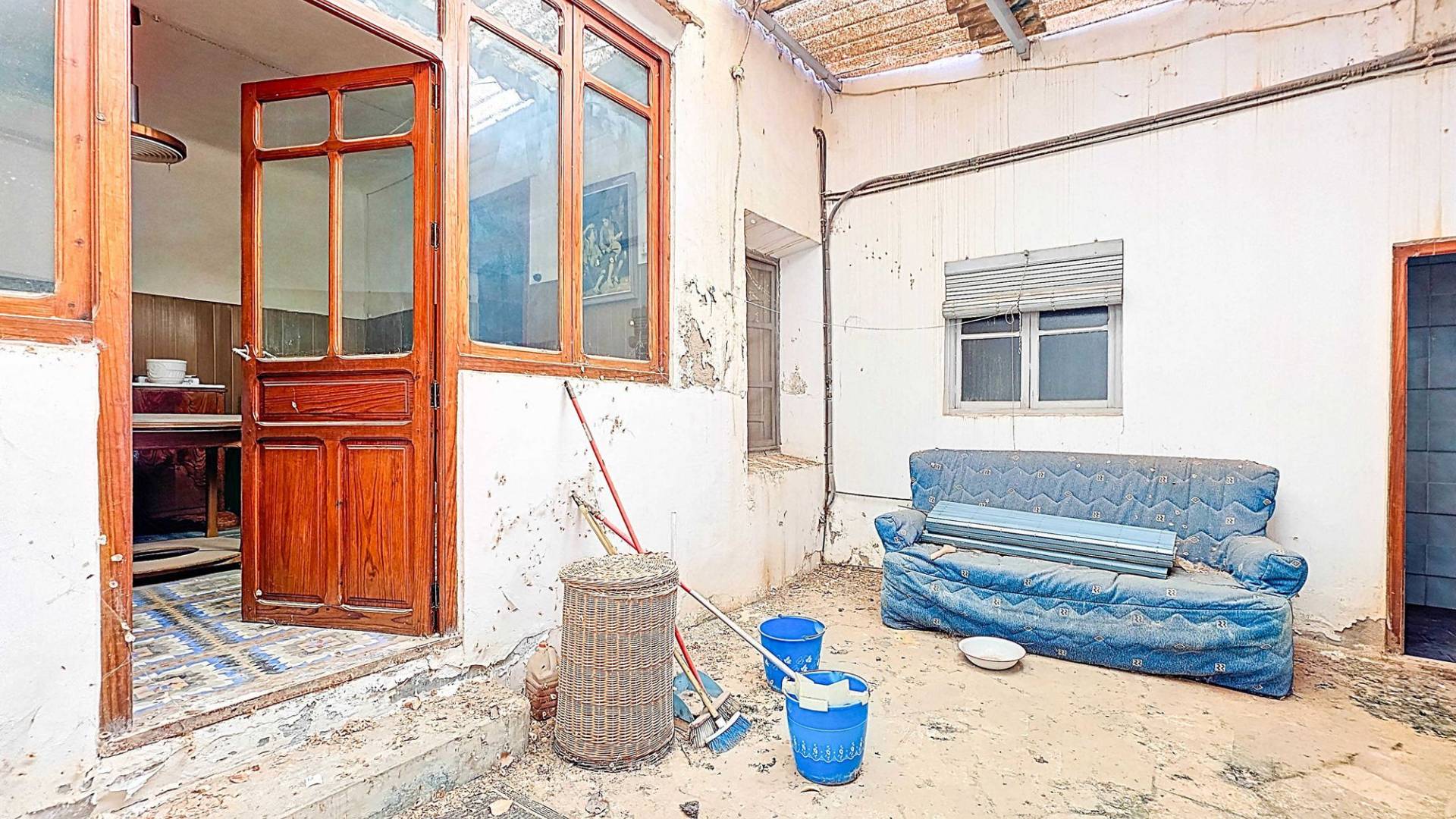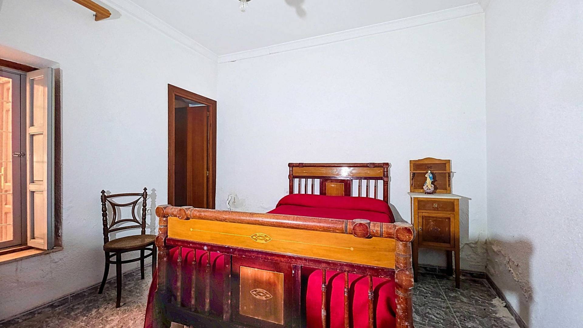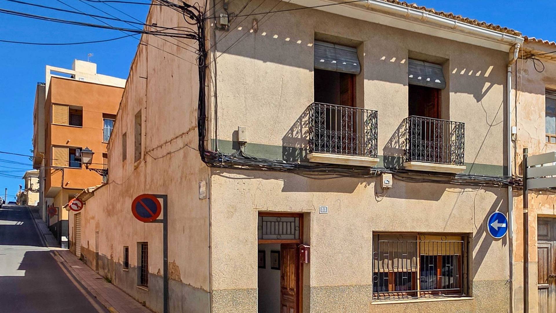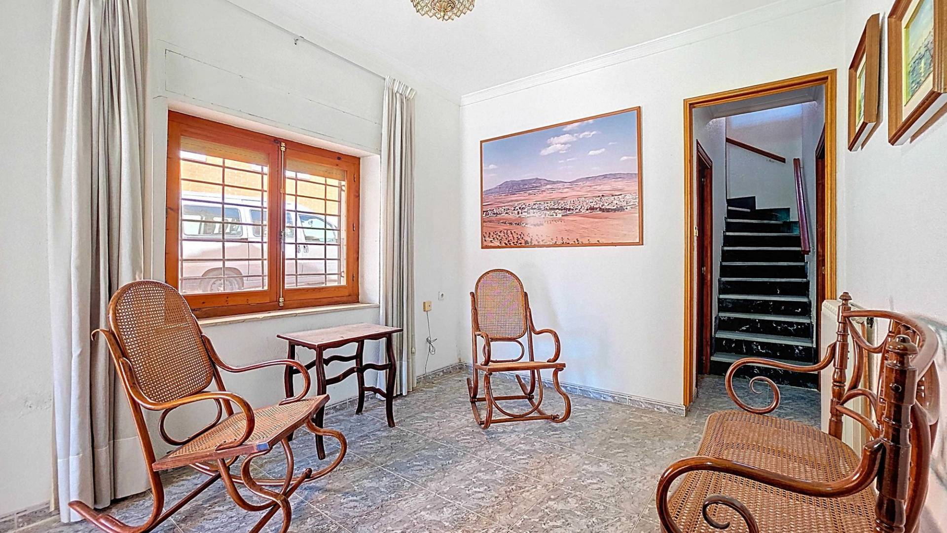 Corner Village House with Two Floors and Garage in Pinoso This very spacious corner house is spread over two floors and is centrally yet quietly located, with all amenities nearby. There is ample street parking, but the property also has its own large garage and a patio/garden room. Some renovation work is needed, but at this attractive price, it has the potential to become something truly special. The Property Ground Floor Part 1: A hallway leads to a central area that can function as an entrance hall, but it’s also spacious enough to be used as a cozy sitting area. There is a large living room with access to a bedroom, which could also be converted into a separate dining room (this room is also accessible from the hallway). The second bedroom on this floor has an ensuite bathroom and access to the large patio, which could be turned into a charming garden room (see impression in the photos). The patio is also accessible from the kitchen. Part 2: The patio has a door to the street and an adjoining room that could be converted into another bedroom or a lovely sunroom with a covered seating area facing the patio. From this room, you can access the spacious garage. A staircase in the garage leads to an additional double space that can be customized to your needs. First Floor From the first section, a marble staircase leads to the upper floor. Here you’ll find a small room, a large bedroom with ensuite bathroom, a spacious hallway with storage, and three more bedrooms, two of which have French balconies. The house is equipped with heating (radiators). Pinoso Pinoso offers all daily amenities, including supermarkets, schools, a medical center, and sports facilities, as well as a wide selection of restaurants. It’s surrounded by almond, olive, and vineyard landscapes and offers many walking, hiking, and cycling routes. Pinoso blends traditional Spanish culture, beautiful nature, and modern amenities with a delightful Mediterranean climate. Both Alicante and Murcia airports and the coast are less than an hour away. Are you the new owner who will modernize this home while preserving its authentic charm? Don’t miss this opportunity to live in the beloved Pinoso – book a viewing today! This property is listed exclusively, which means all documents have been checked in advance and everything is either in order or can be arranged.