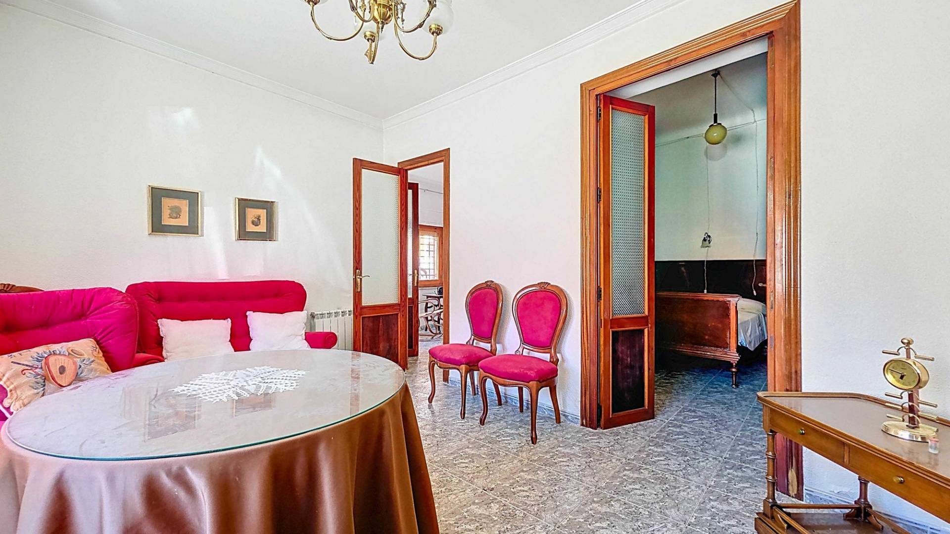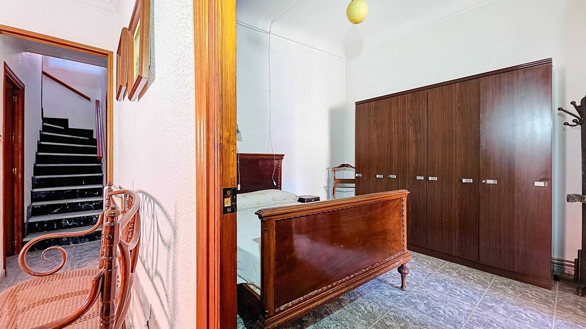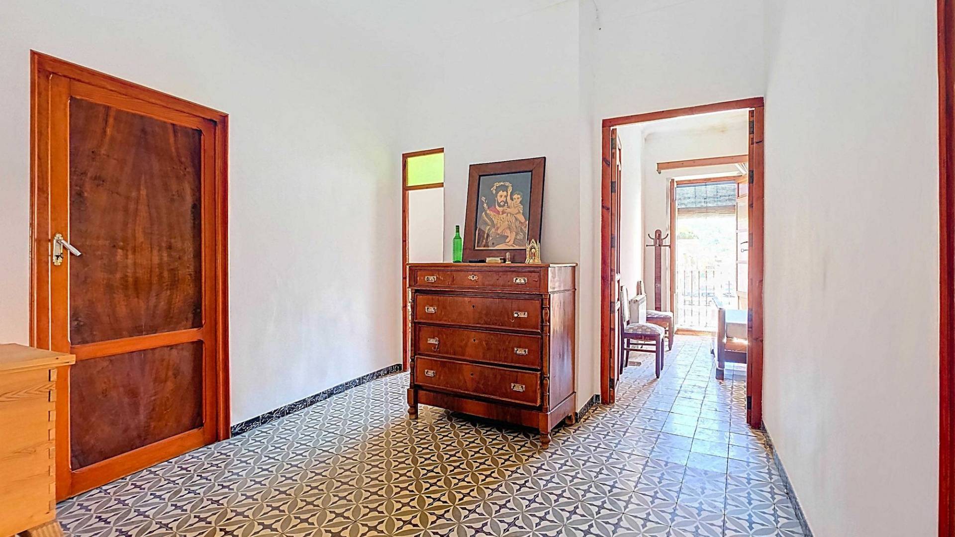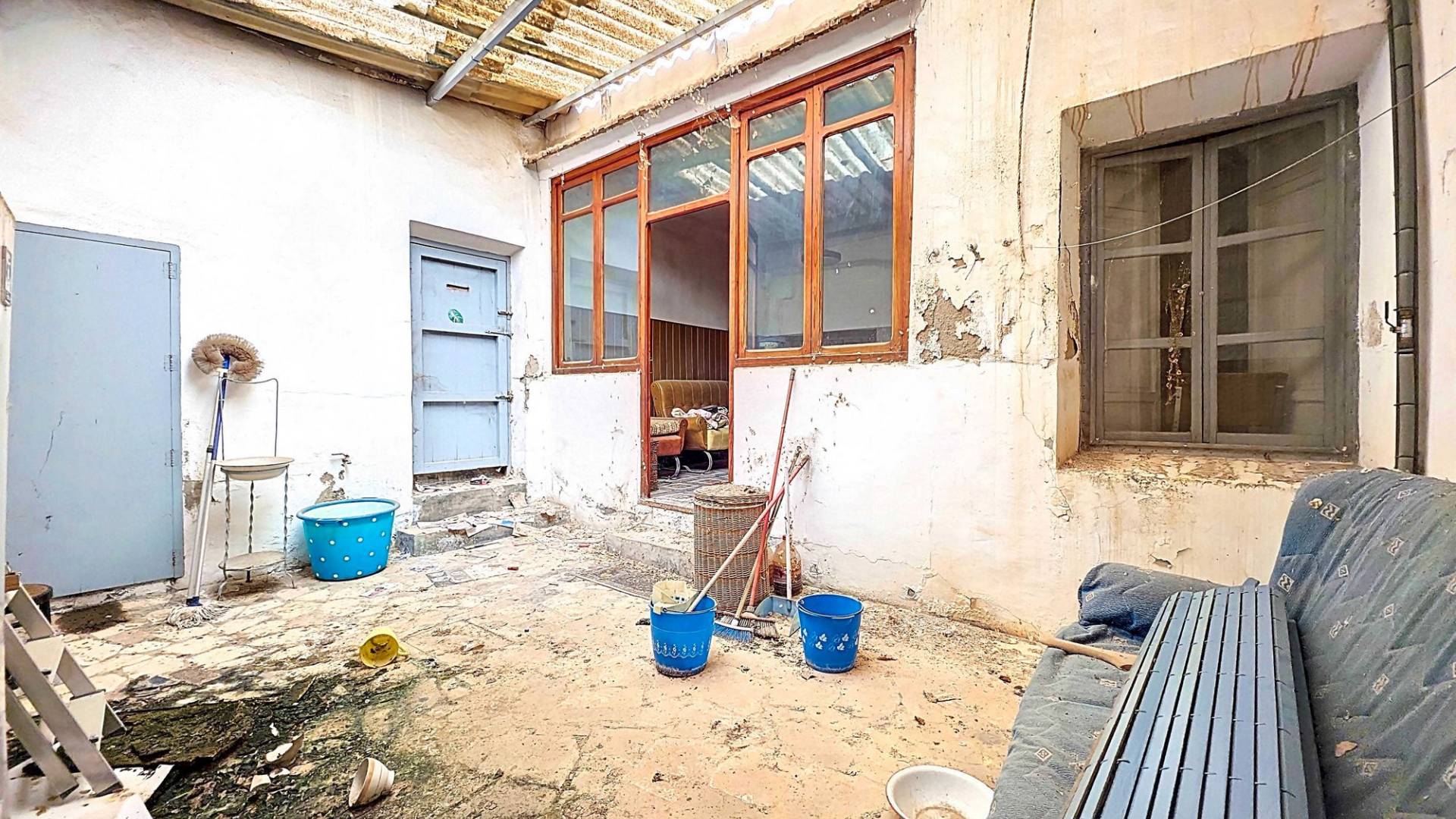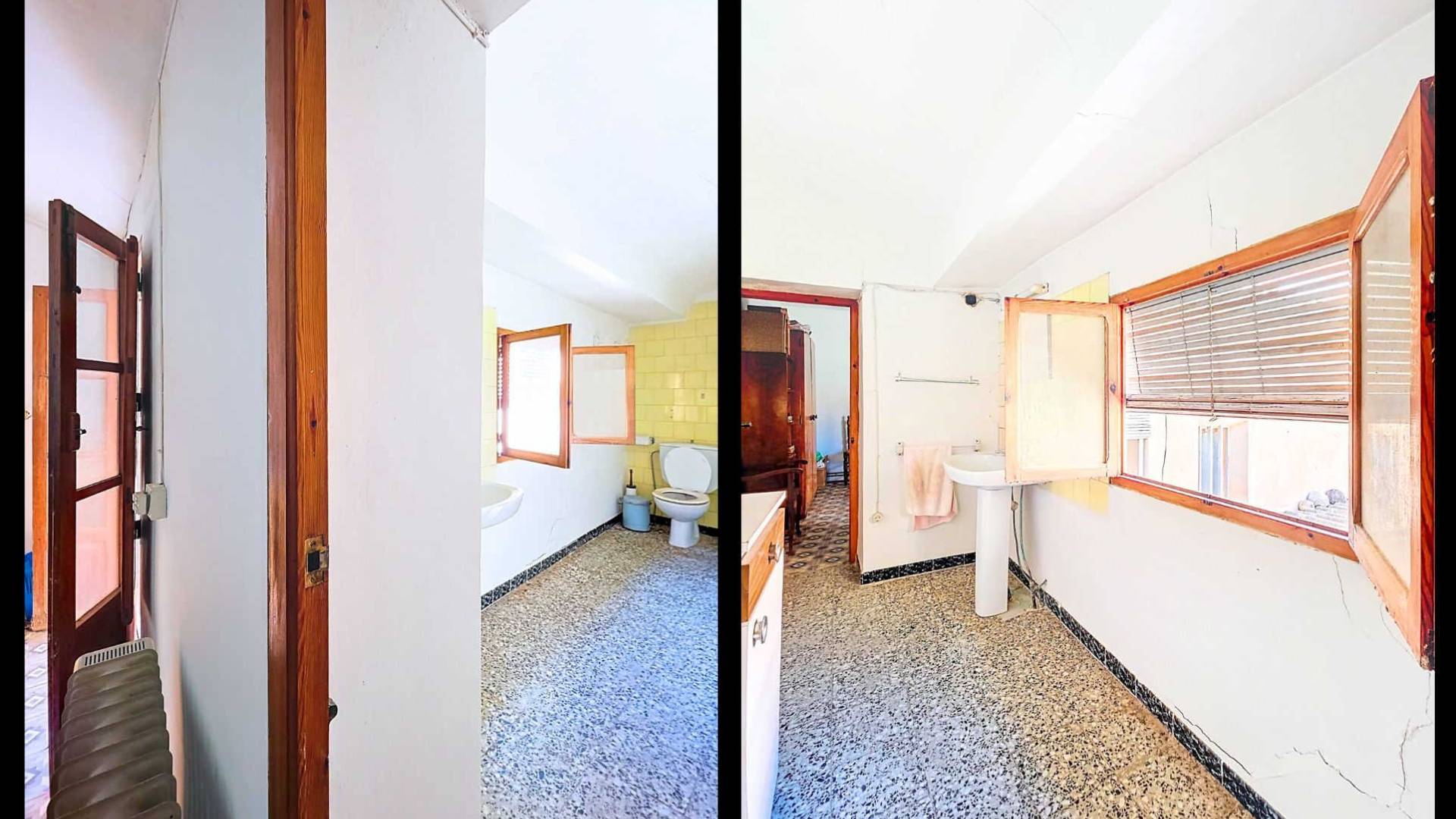 Corner Village House with Two Floors and Garage in Pinoso This very spacious corner house is spread over two floors and is centrally yet quietly located, with all amenities nearby. There is ample street parking, but the property also has its own large garage and a patio/garden room. Some renovation work is needed, but at this attractive price, it has the potential to become something truly special. The Property Ground Floor Part 1: A hallway leads to a central area that can function as an entrance hall, but it’s also spacious enough to be used as a cozy sitting area. There is a large living room with access to a bedroom, which could also be converted into a separate dining room (this room is also accessible from the hallway). The second bedroom on this floor has an ensuite bathroom and access to the large patio, which could be turned into a charming garden room (see impression in the photos). The patio is also accessible from the kitchen. Part 2: The patio has a door to the street and an adjoining room that could be converted into another bedroom or a lovely sunroom with a covered seating area facing the patio. From this room, you can access the spacious garage. A staircase in the garage leads to an additional double space that can be customized to your needs. First Floor From the first section, a marble staircase leads to the upper floor. Here you’ll find a small room, a large bedroom with ensuite bathroom, a spacious hallway with storage, and three more bedrooms, two of which have French balconies. The house is equipped with heating (radiators). Pinoso Pinoso offers all daily amenities, including supermarkets, schools, a medical center, and sports facilities, as well as a wide selection of restaurants. It’s surrounded by almond, olive, and vineyard landscapes and offers many walking, hiking, and cycling routes. Pinoso blends traditional Spanish culture, beautiful nature, and modern amenities with a delightful Mediterranean climate. Both Alicante and Murcia airports and the coast are less than an hour away. Are you the new owner who will modernize this home while preserving its authentic charm? Don’t miss this opportunity to live in the beloved Pinoso – book a viewing today! This property is listed exclusively, which means all documents have been checked in advance and everything is either in order or can be arranged.