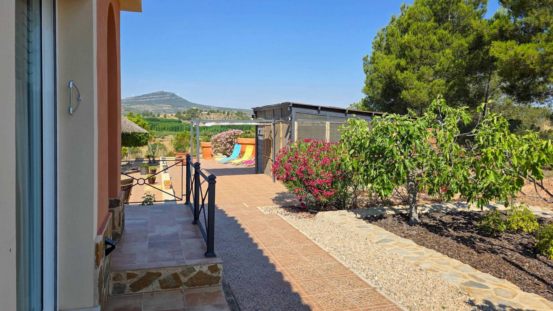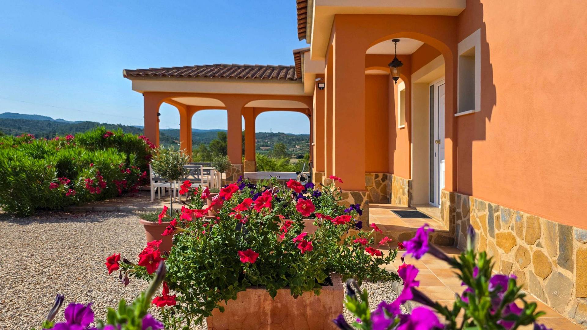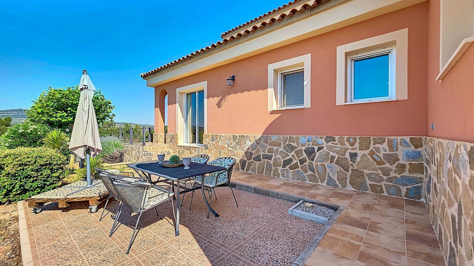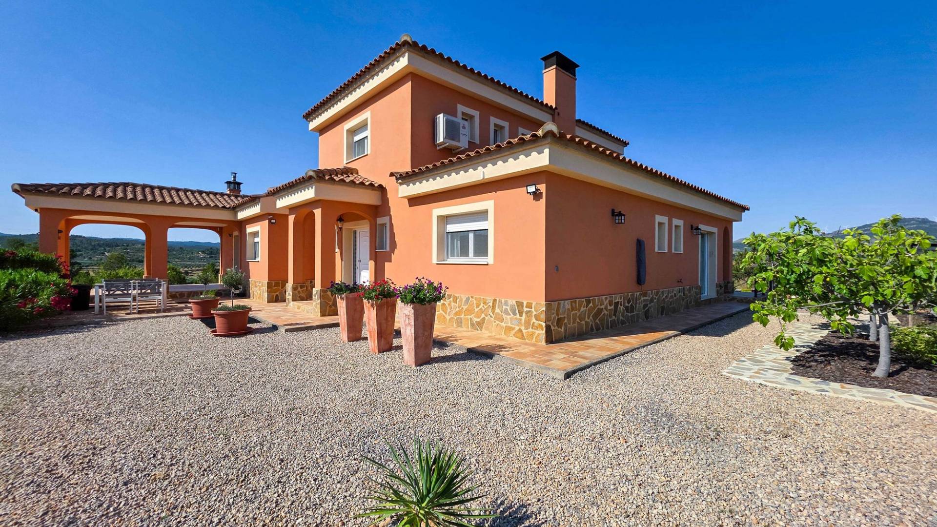 Villa Ayora Beautiful move-in-ready villa with a beautifully landscaped, private garden and fantastic views of the village of Ayora and the surrounding nature. Just a few minutes by car from Ayora lies this stunning villa. It was designed by the current owners, who clearly chose a high-quality finish. The villa is perfectly maintained and ready for new residents. Property Via the driveway, lined with almond trees on both sides, you reach the fenced part of the property. An electric gate provides access to the villa. The plot is situated slightly higher, offering stunning 360-degree views over the valley and the village. The garden around the house is attractively landscaped and meticulously maintained. Several terraces surround the villa, allowing you to enjoy the Spanish lifestyle in the sun or the shade. Or perhaps you prefer to relax with some local wine and tapas in the pergola, which is currently set up as a fantastic outdoor kitchen? Of course, there is also a swimming pool (5x10 meters). The Villa Ground floor: The spacious hallway provides access to all other parts of the villa: the living room, kitchen with adjacent utility room, a bedroom with en-suite bathroom, a storage closet, and a guest toilet. The staircase to the upper floor is also located in the hallway. The generous living room has double doors from the hallway and can also be accessed via the kitchen. Thanks to the many glass (double) doors leading to the terrace, the space receives beautiful natural light. The living room features a cozy central fireplace and air conditioning (hot/cold). There’s a separate, open area that can serve as a TV room, playroom, or home office. On the other side, there's another open area serving as the dining room — ideally located next to the spacious open kitchen. Next to the kitchen is a utility room with three cabinets and another room behind it that houses the technical equipment and provides extra storage space. The mentioned spacious bedroom has an en-suite bathroom and a separate toilet, air conditioning (hot/cold), and built-in wardrobes. First floor: Here you'll find a storage closet, a separate toilet, a large bathroom, and a spacious bedroom with built-in wardrobes and air conditioning (hot/cold). The bedroom gives access to a terrace with spectacular views. Features: Air conditioning Fireplace in the living room Underfloor heating (oil) throughout the villa Connected to mains electricity and water (with softener system) Windows fitted with shutters and insect screens Recently regrouted swimming pool Outdoor shower and toilet by the pool Carport attached to the villa and ample private parking Ayora Ayora is known as one of the most beautiful villages in Valencia. It is a lively and traditional village in the green surroundings of the Ayora valley. The area is rich in historical heritage, such as the castle and the church. Fancy a walk? Stroll through the medieval streets and admire several beautiful Renaissance-style buildings in the village. The surrounding nature also offers wonderful hiking opportunities. Or how about a relaxing day in the nearby thermal baths of Cofrentes, or a canoeing/rafting trip on one of the rivers? All amenities such as shops, restaurants, healthcare, leisure, and schools are available in Ayora. Alicante airport is 1 hour and 15 minutes away, and Valencia airport is 1.5 hours away. Interested in this stunning villa? Feel free to contact us. We’ll be happy to show you the property and arrange a viewing appointment. This property is listed exclusively, which means all documents have been checked in advance and everything is either in order or can be arranged.
