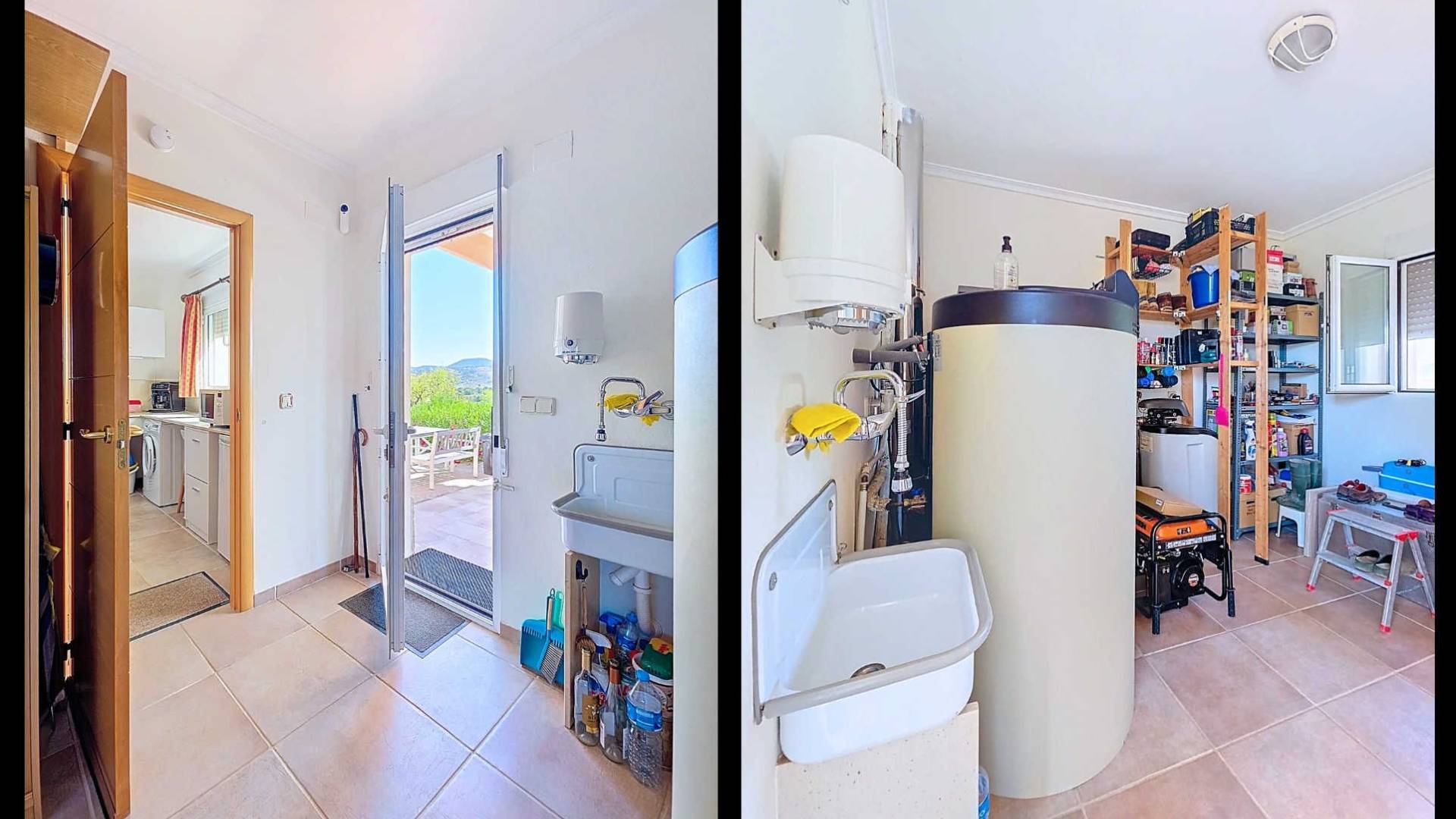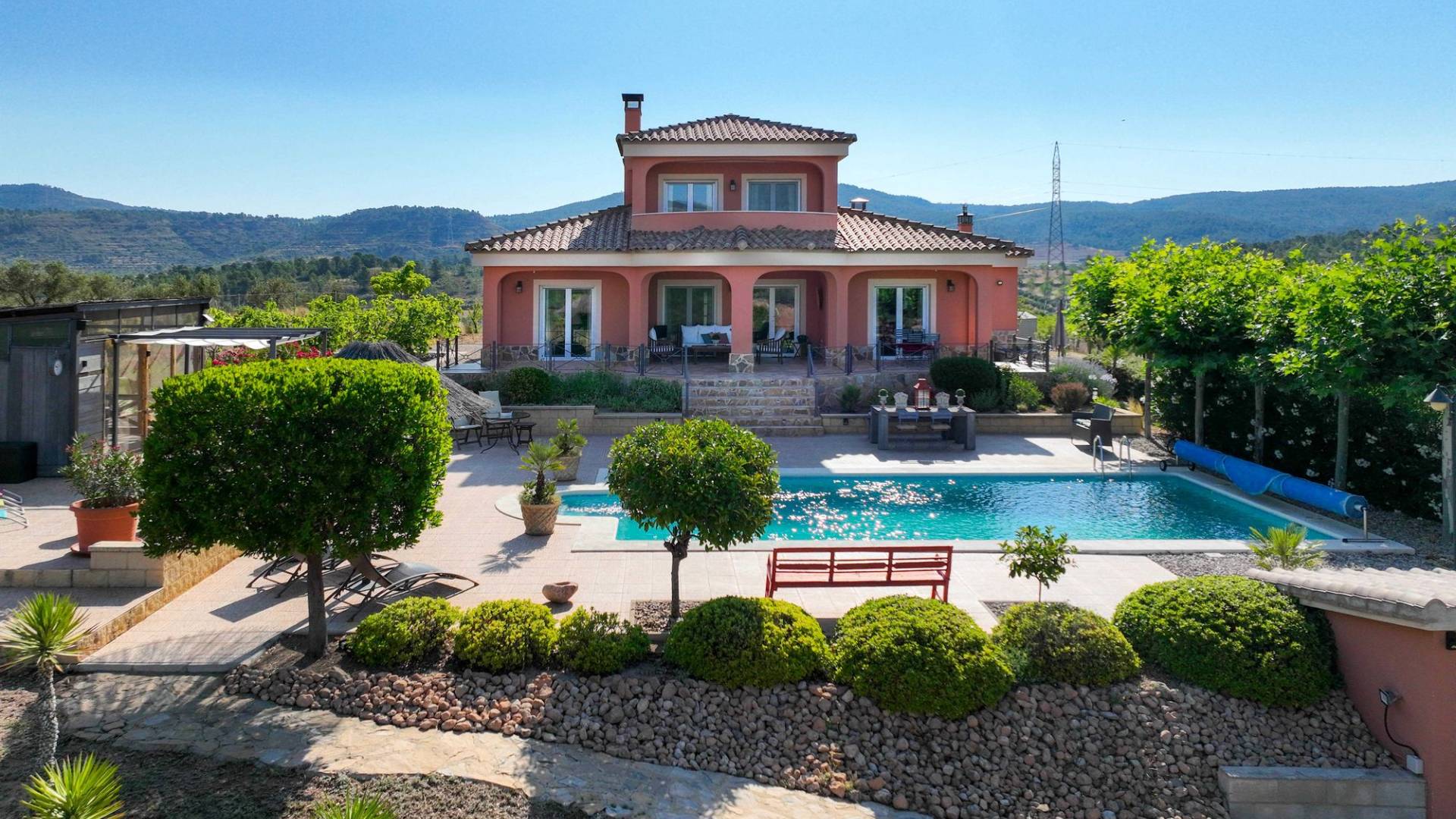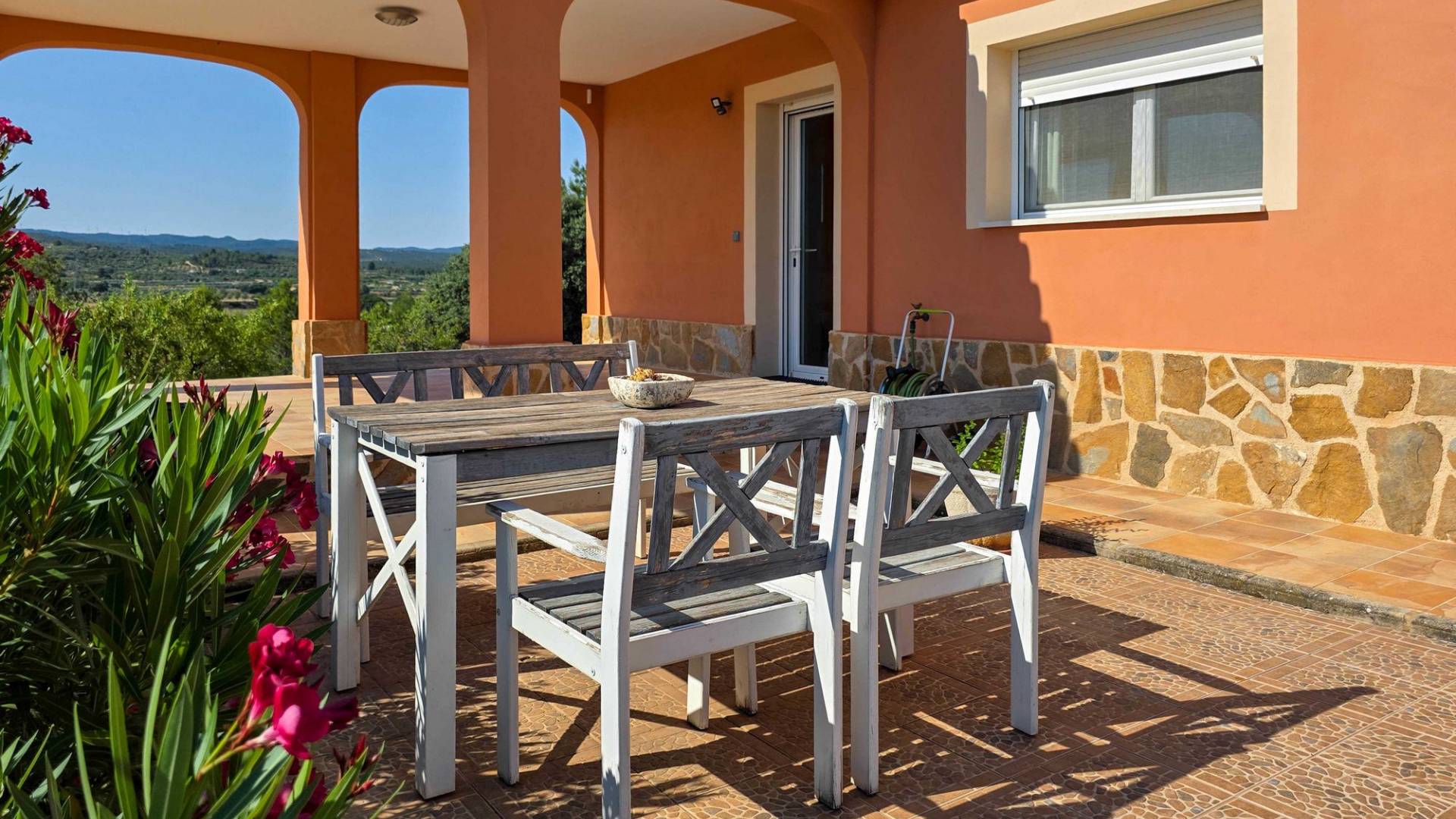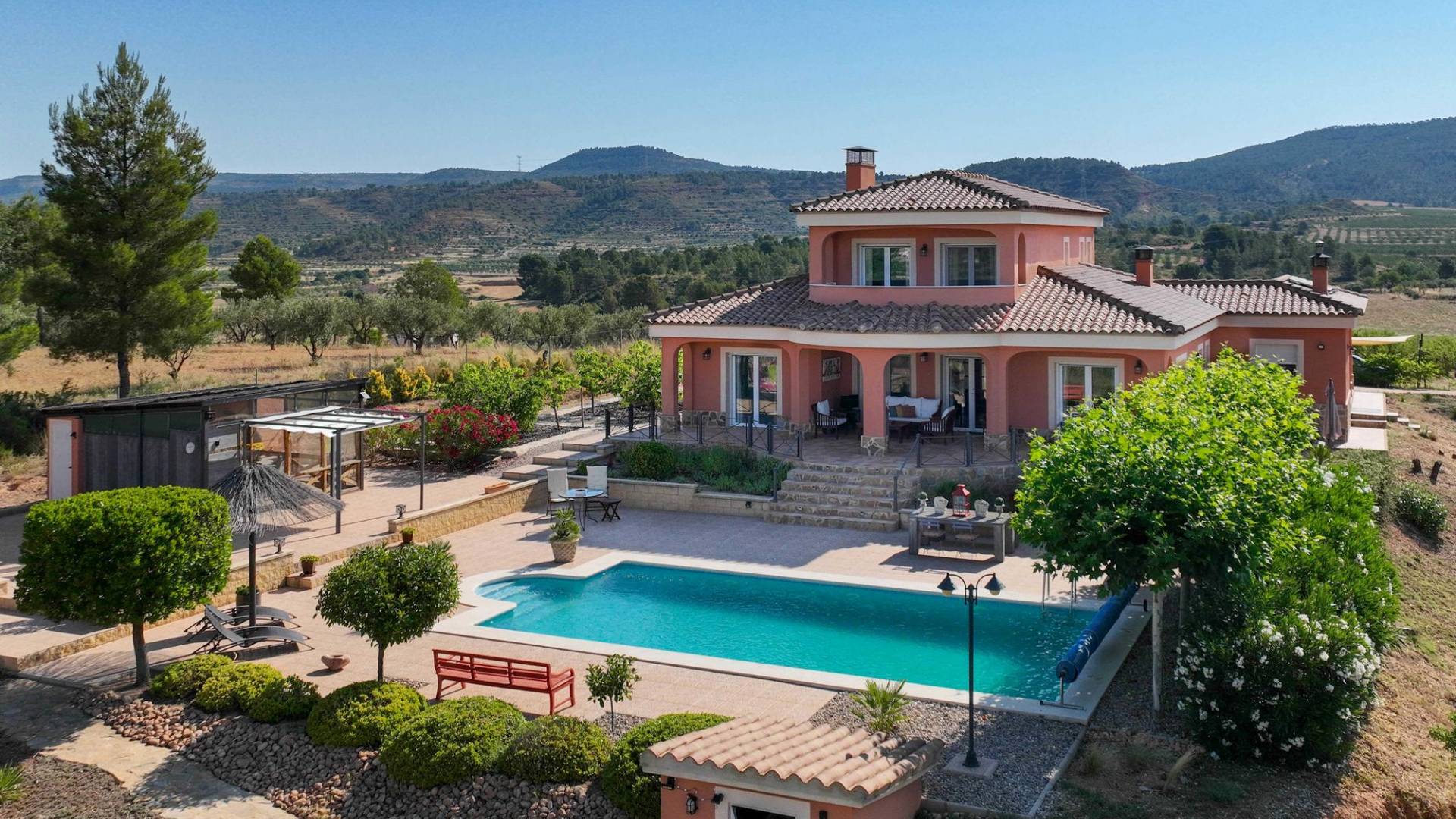 Villa Ayora Beautiful move-in-ready villa with a beautifully landscaped, private garden and fantastic views of the village of Ayora and the surrounding nature. Just a few minutes by car from Ayora lies this stunning villa. It was designed by the current owners, who clearly chose a high-quality finish. The villa is perfectly maintained and ready for new residents. Property Via the driveway, lined with almond trees on both sides, you reach the fenced part of the property. An electric gate provides access to the villa. The plot is situated slightly higher, offering stunning 360-degree views over the valley and the village. The garden around the house is attractively landscaped and meticulously maintained. Several terraces surround the villa, allowing you to enjoy the Spanish lifestyle in the sun or the shade. Or perhaps you prefer to relax with some local wine and tapas in the pergola, which is currently set up as a fantastic outdoor kitchen? Of course, there is also a swimming pool (5x10 meters). The Villa Ground floor: The spacious hallway provides access to all other parts of the villa: the living room, kitchen with adjacent utility room, a bedroom with en-suite bathroom, a storage closet, and a guest toilet. The staircase to the upper floor is also located in the hallway. The generous living room has double doors from the hallway and can also be accessed via the kitchen. Thanks to the many glass (double) doors leading to the terrace, the space receives beautiful natural light. The living room features a cozy central fireplace and air conditioning (hot/cold). There’s a separate, open area that can serve as a TV room, playroom, or home office. On the other side, there's another open area serving as the dining room — ideally located next to the spacious open kitchen. Next to the kitchen is a utility room with three cabinets and another room behind it that houses the technical equipment and provides extra storage space. The mentioned spacious bedroom has an en-suite bathroom and a separate toilet, air conditioning (hot/cold), and built-in wardrobes. First floor: Here you'll find a storage closet, a separate toilet, a large bathroom, and a spacious bedroom with built-in wardrobes and air conditioning (hot/cold). The bedroom gives access to a terrace with spectacular views. Features: Air conditioning Fireplace in the living room Underfloor heating (oil) throughout the villa Connected to mains electricity and water (with softener system) Windows fitted with shutters and insect screens Recently regrouted swimming pool Outdoor shower and toilet by the pool Carport attached to the villa and ample private parking Ayora Ayora is known as one of the most beautiful villages in Valencia. It is a lively and traditional village in the green surroundings of the Ayora valley. The area is rich in historical heritage, such as the castle and the church. Fancy a walk? Stroll through the medieval streets and admire several beautiful Renaissance-style buildings in the village. The surrounding nature also offers wonderful hiking opportunities. Or how about a relaxing day in the nearby thermal baths of Cofrentes, or a canoeing/rafting trip on one of the rivers? All amenities such as shops, restaurants, healthcare, leisure, and schools are available in Ayora. Alicante airport is 1 hour and 15 minutes away, and Valencia airport is 1.5 hours away. Interested in this stunning villa? Feel free to contact us. We’ll be happy to show you the property and arrange a viewing appointment. This property is listed exclusively, which means all documents have been checked in advance and everything is either in order or can be arranged.