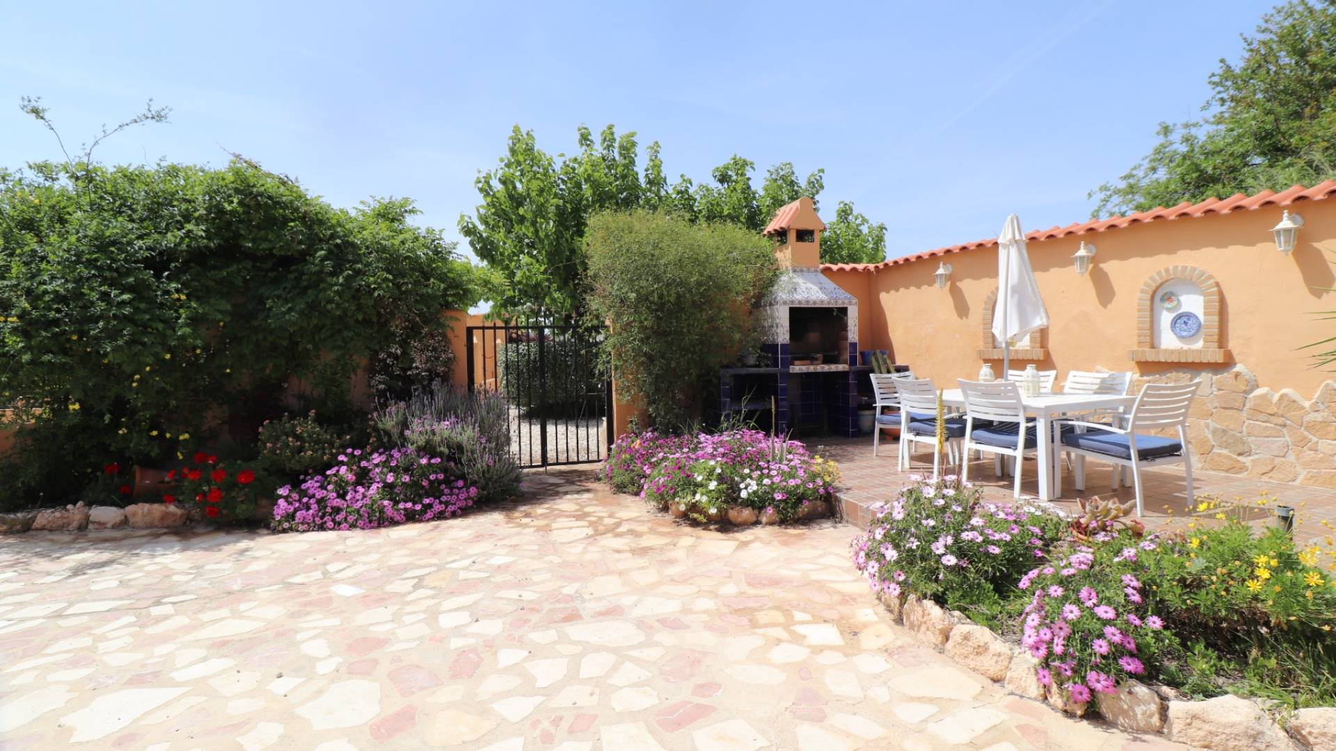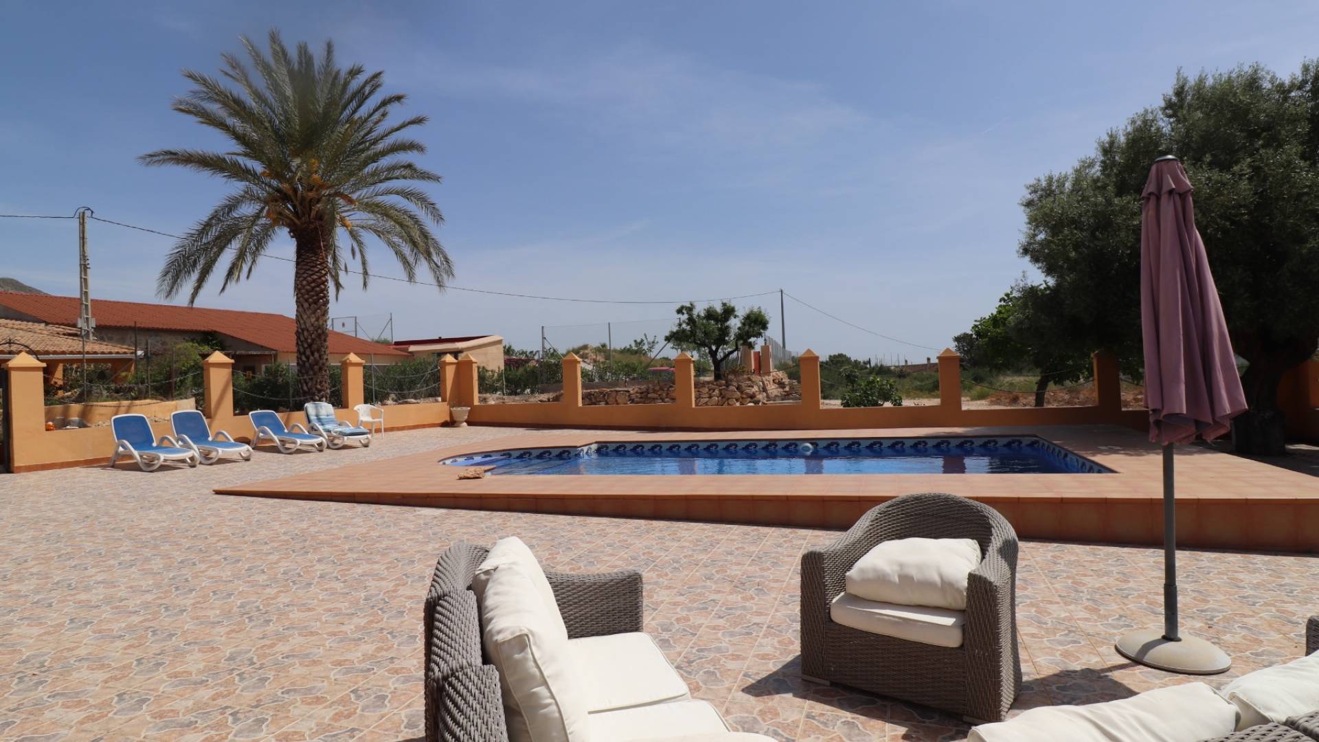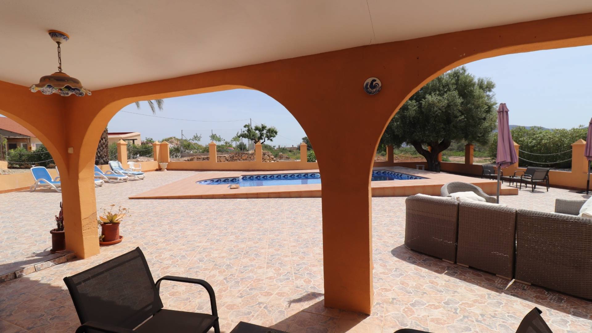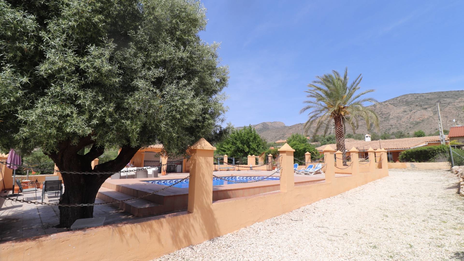 This beautiful property is located in a superb quiet location just a few minutes drive from the 2 villages of Hondon de las nieves and Hondon de los frailes with all amenities. There are more than 400m2 of built area including the main house with a part cave, a pool area with porch, summer kitchen, technical local and toilet, storage, a laundry room and a double garage with workshop that could easily be converted into a separate apartment. The main house consists of several livings, dining room, a kitchen, a pantry and 5 bedrooms and 2 bathrooms. The rooms are in the cave, which brings charm and a lot of freshness in summer. In front of the house, the space is occupied by a covered terrace (30m2) and a spacious terrace with barbecue area. The pool is superb and is located right in front. The house is connected to the water and electricity network, and has internet and a hot/cold air conditioning unit. It is a rare property, with a lot of charm and that must be seen to realize